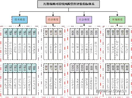 目前国内外指标体系非常多,我们在知网、万方、Springer、ScienceDirect、Wiley Online等数据库中通过初步文献检索,筛选出43个高频指标,接下来采用社会网络分析方法(SNA)进行共词矩阵分析,复筛出37个优势指标,进一步考虑国外典型场地可持续管理指标体系、联合国17个可持续发展目标和我国生态文明建设现实需求等,整体考量与国际接轨、衔接可持续发展、契合中国国情特色、体现指标的区域属性,最终形成涵盖技术纬度、经济纬度、社会纬度和环境纬度等4个纬度的污染场地可持续风险管控评价指标体系。由于评价目标、筛选原则、应用范围不同,每个研究团队所构建的指标体系可能存在差异,此指标体系仅供参考。