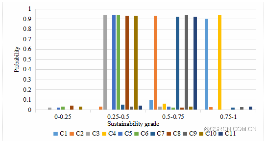 最后,对评价结果进行敏感性分析,从下图可知,随机改变44个可持续评价指标的初始权重(权重总和为1),迭代500次发现,每个场地落入同一可持续等级的概率与当前评价结果无明显差异,以原东方化工厂为例,其可持续等级为强可持续(介于(0.75, 1])的概率为90.4%,远高于其它等级(9.6%)。综合来看,11个场地的检验一致性通过率达94%,其中,原东方化工厂地块较其它场地对权重变化更敏感,可持续分值介于0.7202~ 0.9711。敏感性分析结果表明,权重随机变化并不会对TOPSIS评价结果产生显著影响,在当前案例研究中采用TOPSIS方法相对有效,评价方法可行、结果可靠。