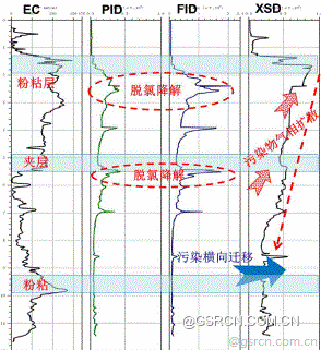 上下两层粉粘阻隔层,造成两层氯代有机物富集。至上而下递减,污染降低;二氯、三氯,还原降解。