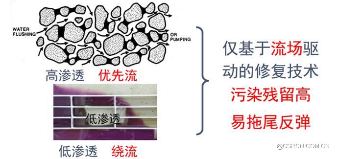 我们需要注意的是:即便是在高渗透地层,抽出处理时也会存在优先流,在毛细作用吸附力作用下有残留的DNAPL;而在低渗透介质的条件下,不论采用冲洗还是抽出,低渗透介质受到的水力影响小,通常会发生绕流。这也是仅基于流场驱动的修复技术污染残留高、易拖尾的原因所在。因此,我们需要解决的关键问题是:如何促使残留的污染物能够高效脱附,以此来提高修复效率。
