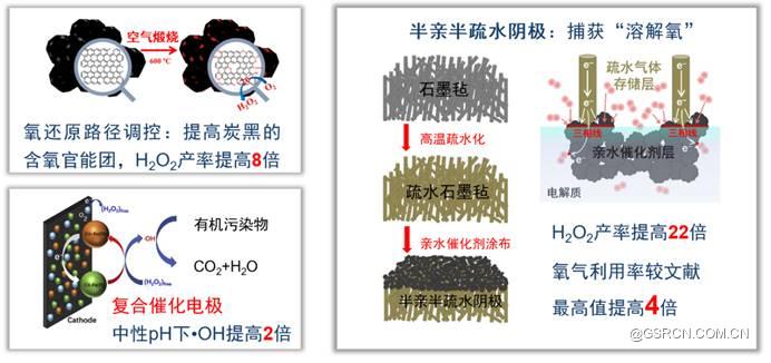 在氧还原阴极方面,我们通过提高炭黑的含氧官能团,使得H2O2产率提高8倍;构建了半亲半疏水阴极,形成疏水的气体存储层,提高H2O2产率。