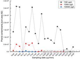 BTEX、CAH_Ar、CAH_a、Phe污染羽面积均呈下降趋势,但超过10000 μg/L的极高浓度污染羽面积降低趋势不明显。污染羽形状随时间推移呈现不规则变化,超过100 μg/L的范围多基本位于地块范围内、由于地下水流向变化的复杂性,污染羽未在特定方向上呈现出增长、稳定或萎缩的状态(图6)。