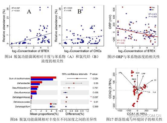 脱氯菌属相对丰度与苯系物浓度呈极显著正相关,但与氯代烃浓度之间相关性不显著。氧化还原电位(ORP)与苯系物浓度呈负相关,且在深层地下水中其相关性更显著。脱氯菌属相对丰度沿深度差异显著,其在14m比8m高14.5±12.6%。pH、氧化还原条件(ORP、Fe(II)、SO42-)及产物Cl-浓度都与群落组成显著相关。