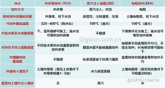 热脱附技术主要有三种类型:原位电阻加热技术(ERH),蒸汽强化抽提技术(SEE)与原位传导加热技术(TCH)。不同的技术方法适用于不用的场景与条件,如图2所示。