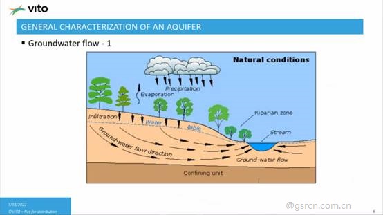 So the first thing I will explain you a bit is how geological and hydrological system is functioning. Everybody knows that groundwater is of course found in the underground. If you make a hole in the ground, in most places of the world, you can find groundwater present in the subsurface. But now groundwater is present in a Boris medium which means that the soil and the rocks are below. The underground has cracks and pause, and water is found in the pause. It is important to understand it because if you want to take a sample its necessary that you understand that the place where you are going to dig sample has enough and significant groundwater available to take a sample because not in every soil you can easily take groundwater or water samples. For example, heavy clay layer, it’s extremely difficult to pump groundwater samples from that type of soil. On the right side of my slide you see a profile in which I tried to explain the difference between layers which are Impervious, which are Aquitards, the terminology generally used for a layer which is very Impervious meaning that water is not really flowing there, and there is no water available for pumping up. It does not mean that there is no water in there. It just says that it is not available when you want to pump it. Where do we pump the water then from or take a sample? And that is the layer which is called aquifer. an aquifer layer is most of the time sandy layer and in that layer we also put our wells for example pumping drinking water and that is also the places where we can most of the time take nice samples for analytical evaluation and see how the quality of ground water is. Groundwater flow is another item which you have to understand before going to the field because the place where you want to take a groundwater sample is depending on the groundwater flow and in this little figure, I show you the water balance in natural conditions which means that water is infiltrating into the oil and is flowing towards most of the time in our nature water is ending up in a river. So that means all the places in which you want to know where the water quality is are somewhere between the river and riparian area where the water entered the groundwater system. So, you have to know where you want to take a sample and understand where the water is coming from. And if there is pollution you also the kind of system to understand where the pollution is moving to, so that you can take a