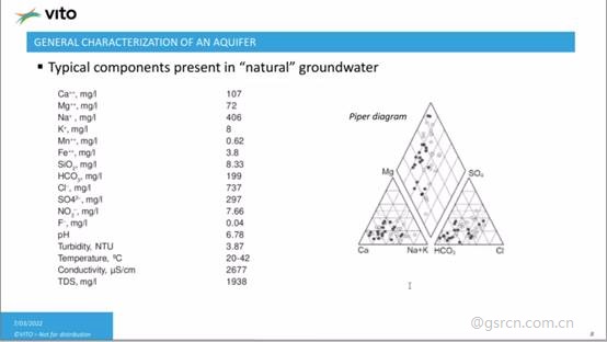 Groundwater quality what we will talk about a little bit today. There are two different types of components present in groundwater. on the screen are those in natural condition you will find most of these elements in groundwater that are not affected by human impact because we as humans we all use chemicals which are not really present in natural conditions. So if we have a natural groundwater it is best to take samples and analyze on these components. You also see that the concentration here is given in milligrams per liter. And that’s a big difference between which we will see in the groundwater systems which are polluted there we go into that level of the micrograms which means that is much more difficult for laboratories to define the parameters or the pollutants instead of these natural components. Why is this interesting to know these differences is that there are many parameters available because we can classify types of groundwater. For example, if you are living in an area where there is a lot of calcareous rock then you will have a lot of calcium and column in the groundwater. And a system to identify these types of ground water is presented in the graph which I show on the right side of the slide called a Piper diagram where you can see all different dots representing a certain number of compositions of groundwater and you can define different groups and types of groundwater system in the areas where you have to investigate.