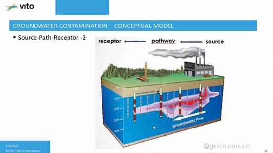 This is another type of visualization of the source spot receptor concept. In this case, there is an industrial site of pollution. If we really want to know how many locations we have to sample, it is also a very good exercise to optimize the number of observation wells which you need and where you have to do that sampling. You have to consider that the more installation you do more expensive it becomes and there is always somebody has to pay for it. So, that is why you have to understand the groundwater systems, how the flowing is and how the source spot receptor way is before you go on the field with your drilling machine and install all these observation wells which can lead to many samples. If the samples which you have taken are not useful, then it is a waste of money. So you always have to do a proper desk study before you can go on the field and installed all the items which you need for your proper ground water sampling.